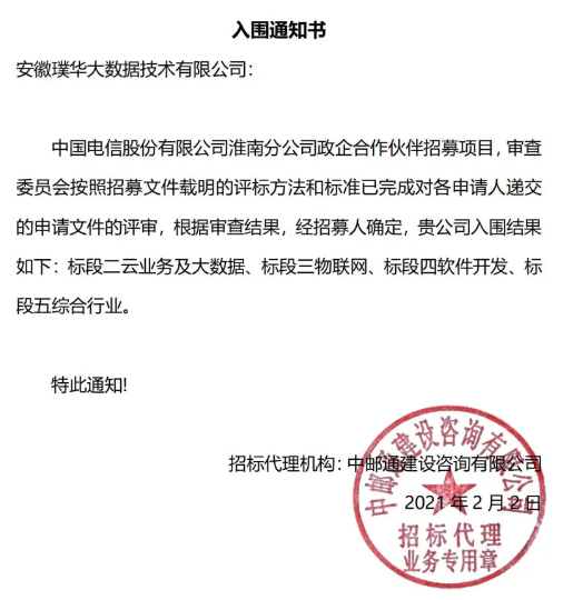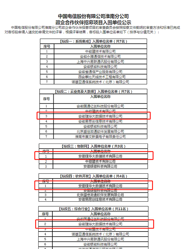 根据评审结果,安徽璞华大数据技术有限公司成功入围,成为中国电信股份有限公司淮南分公司政企信息化合作伙伴,入围结果如下:标段二云业务及大数据、标段三物联网、标段四软件开发、标段五综合行业。